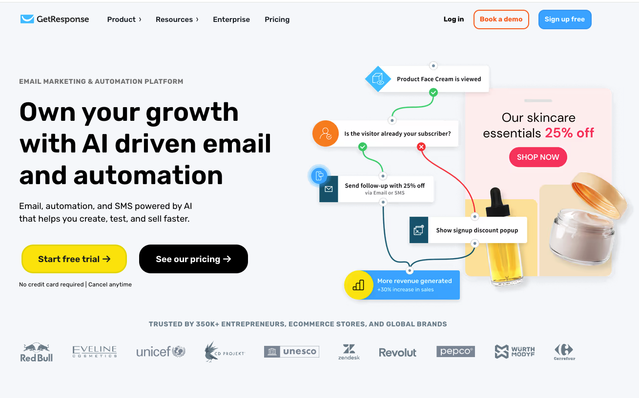 GetResponse is the AI-driven email and automation platform that helps businesses grow smarter on the channels they own - with unlimited sends, transparent pricing, and powerful ecommerce-ready automation.