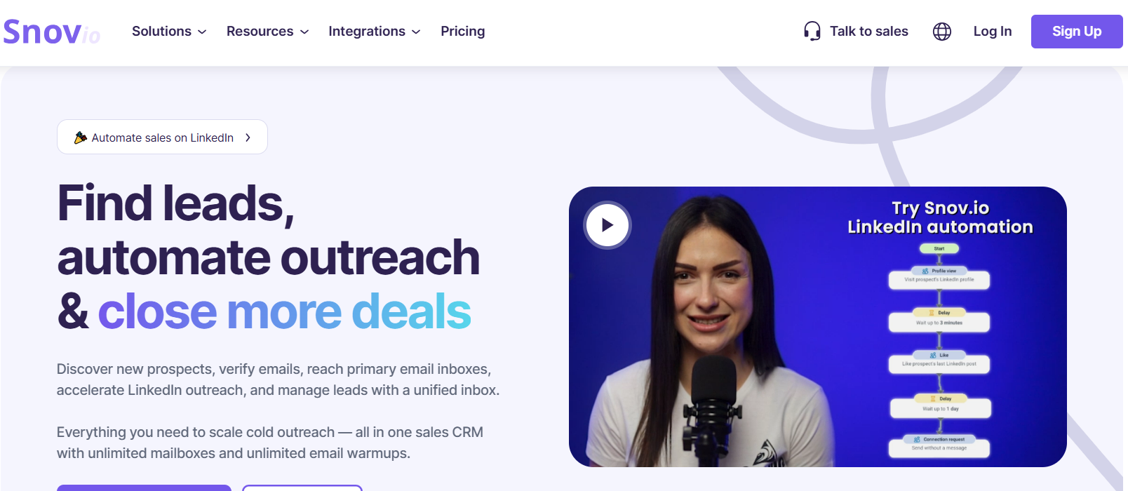 Snov.io is an all-in-one B2B sales automation and CRM platform that helps teams find, verify, and engage leads at scale. It combines email finder, email verification, cold email sequences, LinkedIn automation, email warmup, and a built-in CRM in a single workspace.